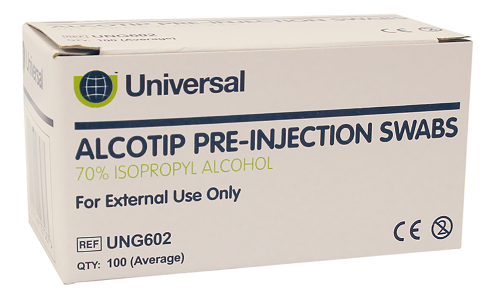 Alcotip Pre-Injection Swabs are designed for pre-injection site cleansing and are supplied in individual packs to reduce cross infection risk. Each non-woven swab is impregnated with a 70% Isopropyl Alcohol solution, which disinfects and lowers the skin bacteriological count prior to administering an injection. Alcotip Pre-Injection Swabs are singly packed for convenience and waste/cost reduction.