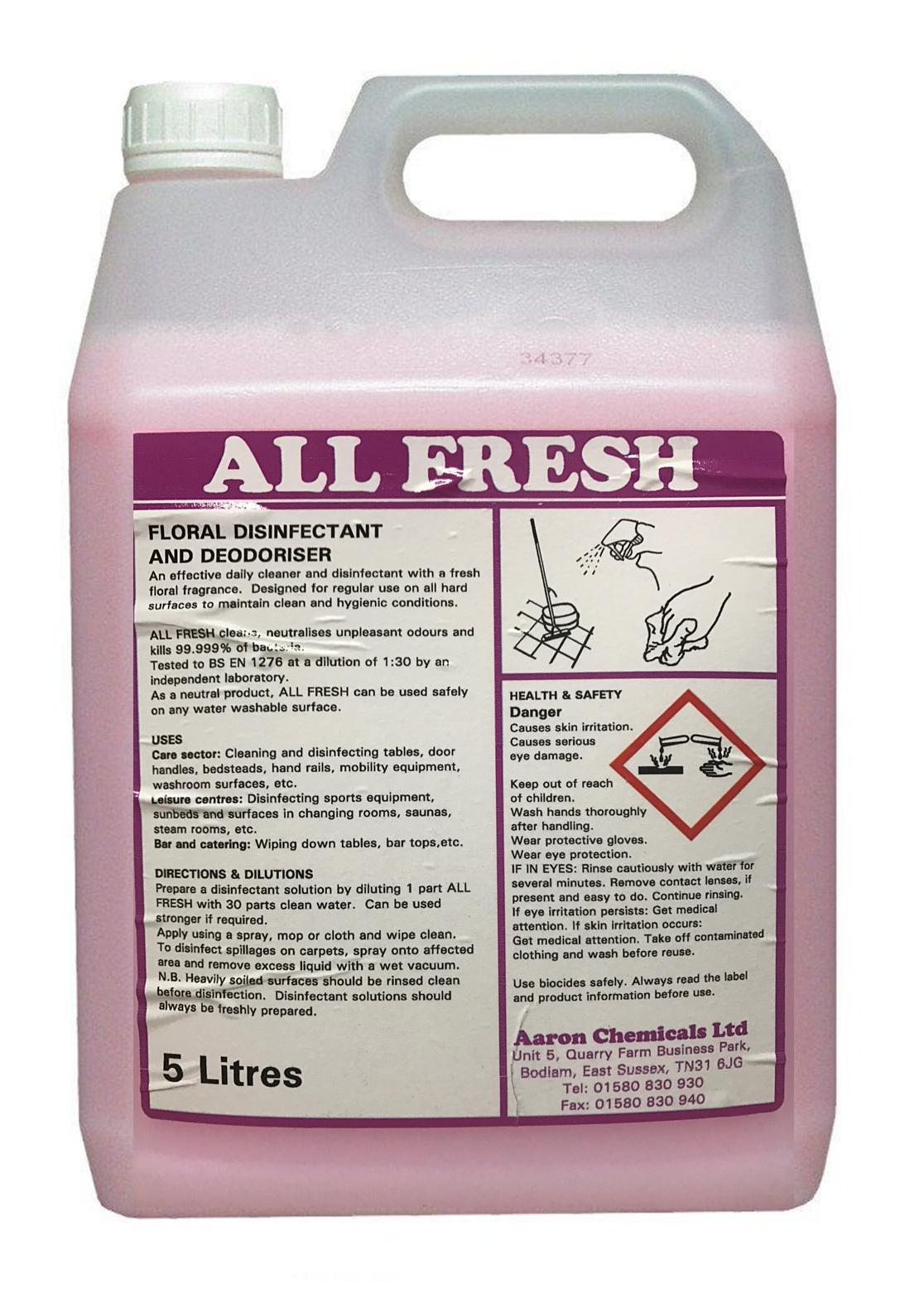 All Fresh is one of the most versatile chemicals on the market. All Fresh can be used for a multitude of cleaning applications, making it unnecessary to use other products. Allfresh is a five in one. It disinfects, cleans, airfreshens, deodorises, and kills bacteria.