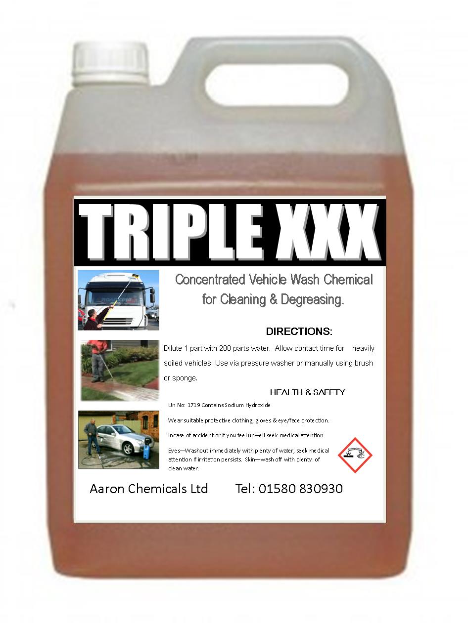 Triple XXX, Powerful TFR at its best, This Traffic Film Remover will dilute 500:1 with water. All you need is a splash in a bucket for heavy duty lorry washing. DILUTES 500:1 with water.